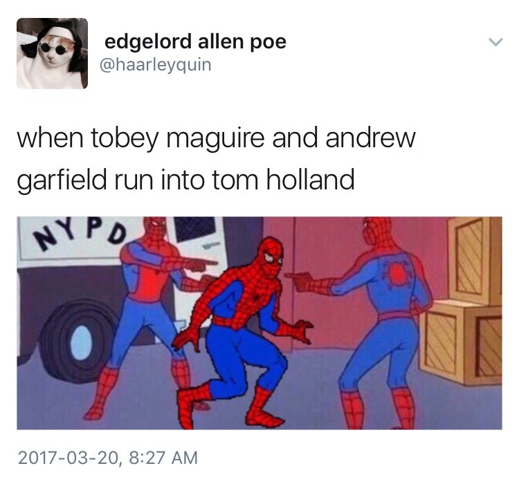 DragonChica Uncategorized March 21, 2017December 10, 2018 1 Minute dailyspiderman: when tobey maguire and andrew garfield run into tom holland Share this: Click to share on X (Opens in new window) X Click to share on Facebook (Opens in new window) Facebook Like Loading... Related Published by DragonChica Just a writer of a few fanfics and headcanons for multiple fandoms View all posts by DragonChica Published March 21, 2017December 10, 2018