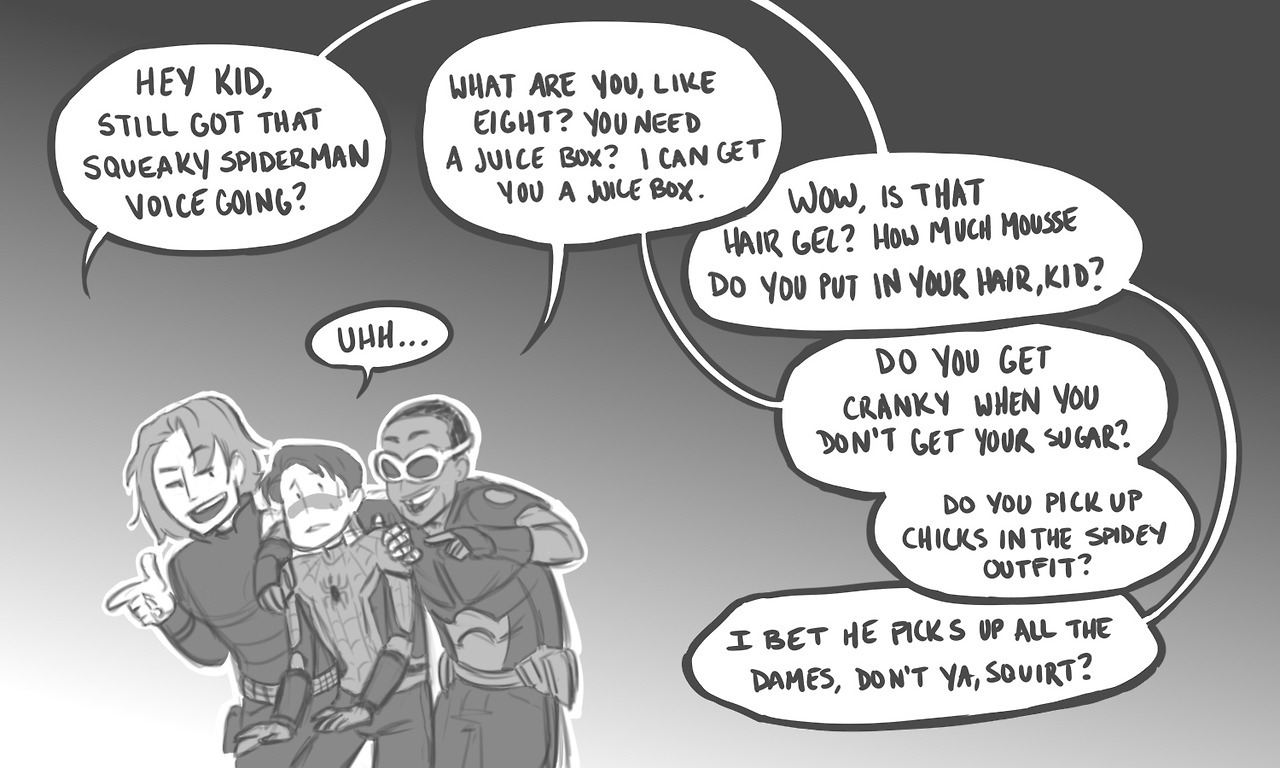 Bucky&Sam: So much asshole teasing. Like too much. Like quite a lot amount. Peter: Uhh… DragonChica July 27, 2017 Published by DragonChica Just a writer of a few fanfics and headcanons for multiple fandoms View all posts by DragonChica Published July 27, 2017