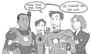 Tony: Sure took your time. We thought you got lost. DragonChica July 27, 2017 Published by DragonChica Just a writer of a few fanfics and headcanons for multiple fandoms View all posts by DragonChica Published July 27, 2017